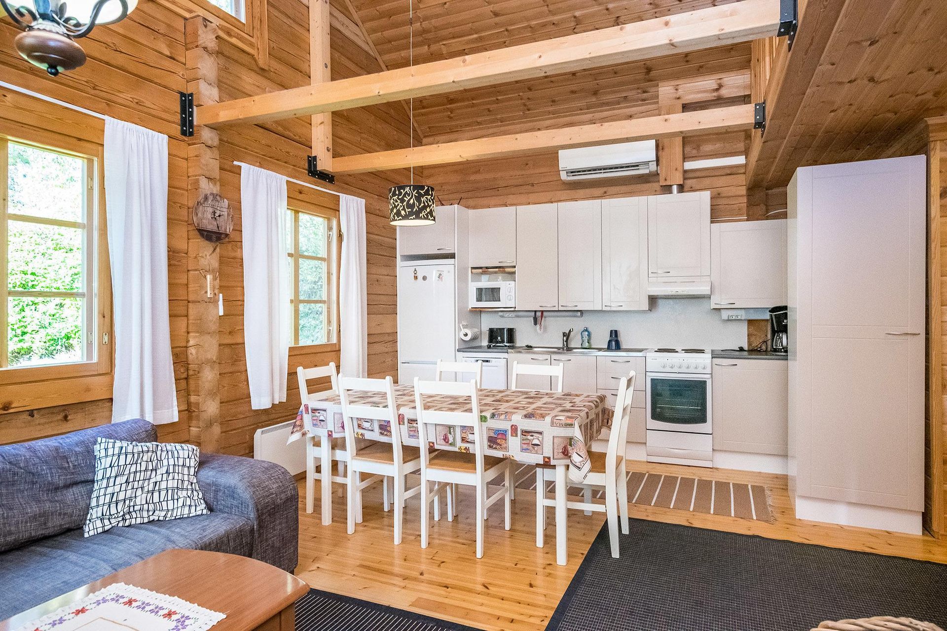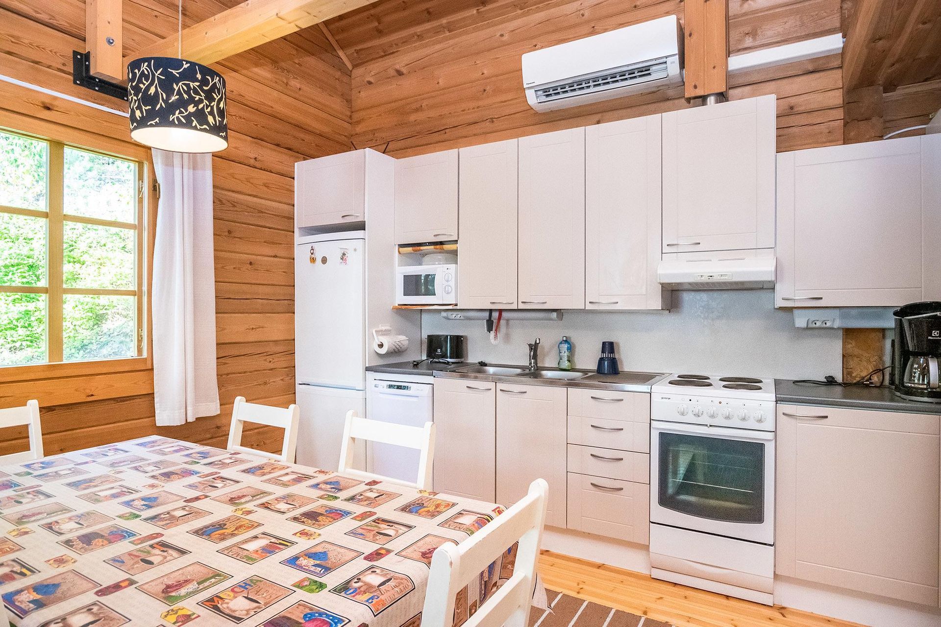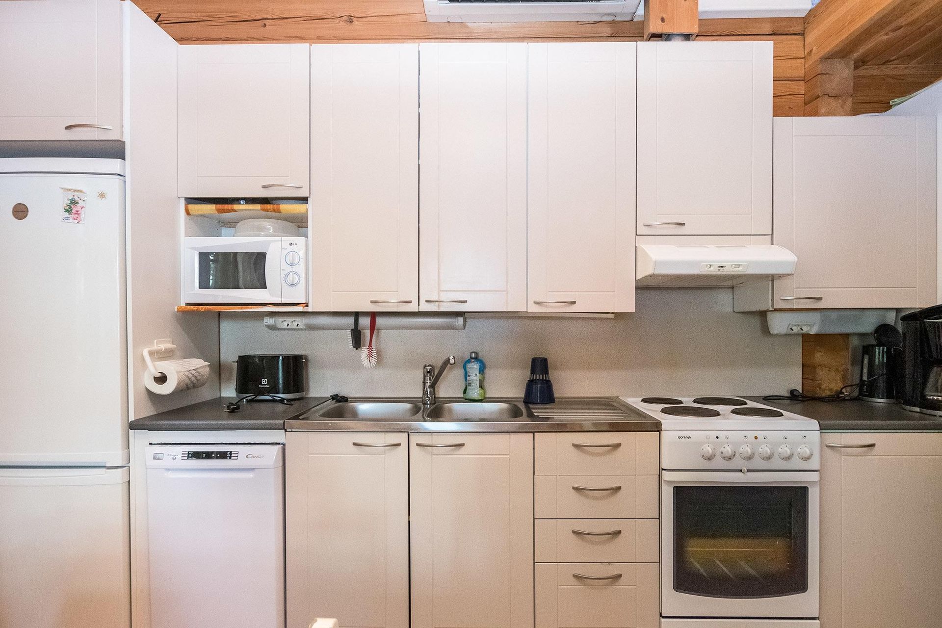 - sähköliesi, jääkaappipakastin, astianpesukone, mikroaaltouuni, kahvin- ja vedenkeittimet, leivänpaahdin, astiasto 6 henkilölle